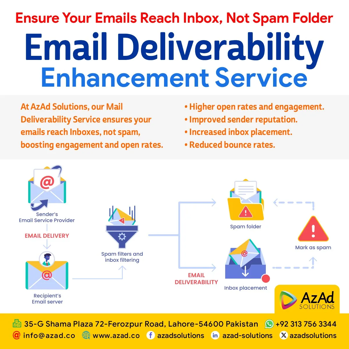 At AzAd Solutions, we know how crucial it is for your emails to land in your recipients’ Inboxes, not in the spam or Promotions folders. Our Mail Deliverability Enhancement Service is designed to thoroughly evaluate your current email practices, pinpoint issues, and offer actionable solutions to improve your email deliverability.